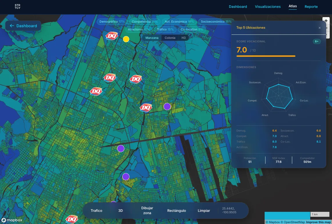 En STRTGY, rediseñamos dónde y cómo crecen las empresas. No dejamos tu expansión al azar ni al “olfato” inmobiliario. Somos una plataforma de inteligencia geoestadística que aplica IA para decidir, con precisión, la ubicación de tu próxima sucursal, la vocación de un terreno o el tenant mix que maximiza el valor de tu activo.